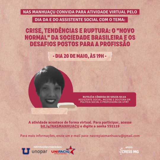 A atividade conta com a participação especial de Rutélia Silva, assistente social e professora da UFMT, que abordará sobre o “novo normal” da sociedade brasileira devido à pandemia e os desafios postos para a profissão.