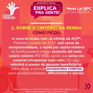A nova lei acaba com os efeitos da ACP*. Portanto, a partir de 2022, nos casos de excepcionalidade, a renda per capita máxima da família poderá chegar somente até meio salário mínimo (R$ 550), sendo que antes era possível ultrapassar esse valor. Ou seja, reduzirá o acesso de pessoas beneficiárias. Além disso, a nova lei acrescentou critérios para excepcionalidades, dificultando o acesso.