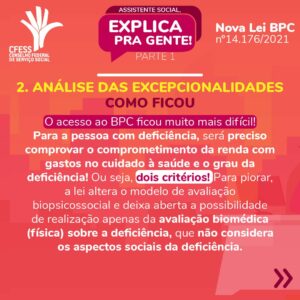 “Em resumo, a nova lei dificulta e limita o acesso de pessoas idosas e deficientes ao BPC, pois propõe formas e critérios excludentes, que vão na contramão do Estatuto do Idoso, da Convenção Internacional da Pessoa com Deficiência e de todos os parâmetros amparados no modelo biopsicossocial para fins de avaliação da deficiência”, critica a conselheira do CFESS Lylia Rojas, assistente social do INSS.