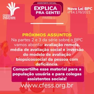 Dividida em três partes, a série traz um conteúdo didático, mostrando os principais retrocessos da nova lei. “Como é algo que impacta em diversos aspectos do BPC, é importante abordamos o conteúdo ponto a ponto, inclusive para que assistentes sociais possam utilizar o material para informar a população usuária sobre os prejuízos com a nova lei”, ressalta a conselheira.