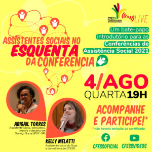 Na live, ela conversará com a assistente social, consultora e doutora em Serviço Social pela Pontifícia Universidade Católica de São Paulo (PUC/SP), Abigail Torres. A conselheira do CFESS acrescenta: “queremos debater com a categoria sobre como assistentes sociais, trabalhadores/as do Suas, podem contribuir com o processo de participação e controle social como forma de afirmar a assistência social como direito”, completa Melatti.