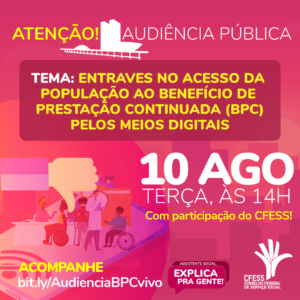Diante desta situação, o CFESS articulou, juntamente com parlamentares da Câmara dos Deputados em Brasília (DF), uma audiência pública na próxima terça-feira, 10 de agosto, na Comissão dos Direitos da Pessoa com Deficiência, às 14h (horário de Brasília). O evento será virtual e quem quiser poderá assistir pelo link https://bit.ly/AudienciaBPCvivo.