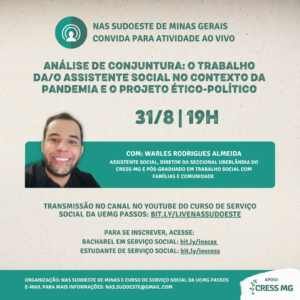 Participe da live do Núcleo de Assistentes Sociais Sudoeste de Minas Gerais, em parceria com o Curso de Serviço Social da UEMG Passos, na próxima terça-feira (31/08), às 19h!