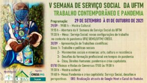 Mediante o contexto social de pandemia da Covid-19 e de novas configurações no mundo do trabalho, o Curso e o Departamento de Serviço Social da Universidade Federal do Triângulo Mineiro (UFTM) promovem, no formato online, a 5ª Semana de Serviço Social da UFTM que visa promover reflexões, diálogos e debates sobre atual conjuntura e também sobre os desafios e perspectivas que estão postas para a formação e trabalho profissional, seu exercício em diversos campos de atuação, seus novos arranjos e adaptações a sociedade pandêmica.