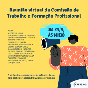 No dia 24/09, às 14h30, tem reunião virtual da Comissão de Trabalho e Formação Profissional do CRESS-MG que é aberta a toda a categoria.