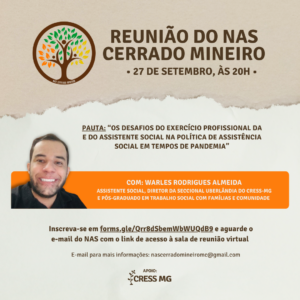 O debate com o tema Os Desafios do Exercício Profissional da e do Assistente Social na Política de Assistência Social em Tempos de Pandemia acontece na próxima segunda (27/09), às 20h, pelo Google Meet.