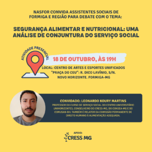Segurança Alimentar e Nutricional será o tema do debate, que acontece às 19h, na Praça do Ceu (Centro de Artes e Esportes Unificados), em Formiga.