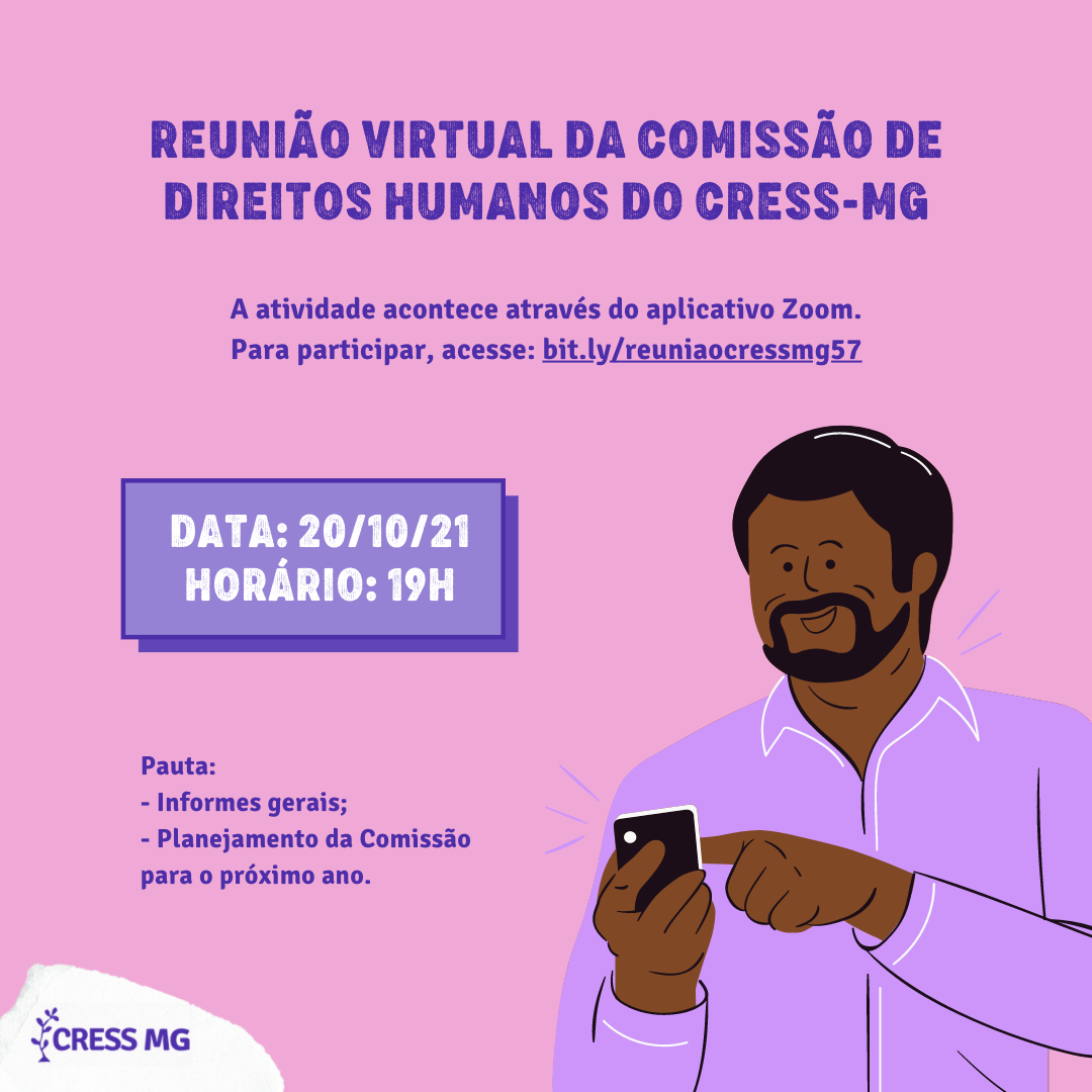 Esta quarta-feira, 20/10, às 19h, tem reunião mensal da Comissão de Direitos Humanos do CRESS-MG que é aberta a toda a categoria.