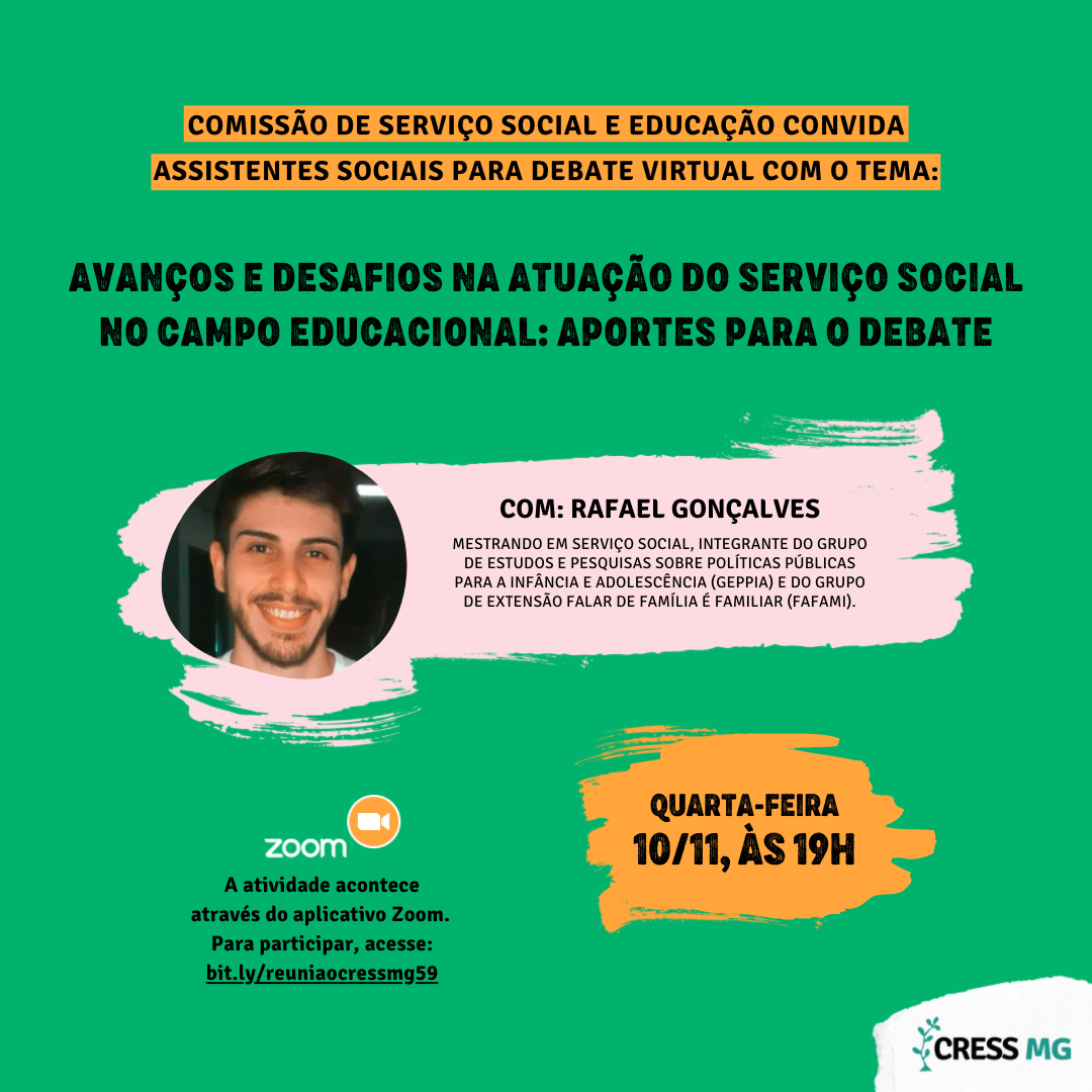 Na ocasião, Rafael Gonçalves facilitará o debate com o tema “Avanços e desafios na atuação do Serviço Social no campo educacional: aportes para o debate”.