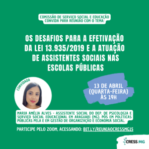 Sempre trazendo temas que estão em alta na categoria, nesta quarta-feira, 13/04, às 19h, o CRESS-MG promove, através da reunião da Comissão de Serviço Social e Educação, uma conversa sobre “Os desafios para efetivação da Lei 13.935/2019 e a atuação de assistentes sociais nas escolas públicas”.