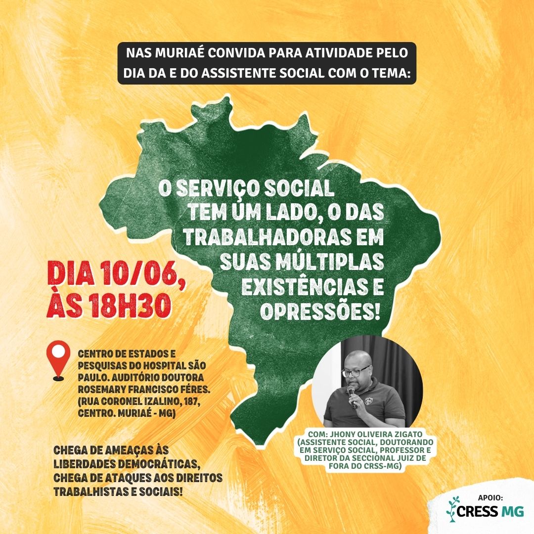 Em ritmo de comemoração pelo Dia da e do Assistente Social, o NAS Muriaé convida pra atividade com o tema “O Serviço Social tem um lado, o das trabalhadoras em suas múltiplas existências e opressões”.