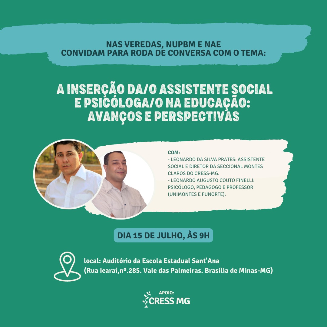 Se você é assistente social ou psicóloga/o e está em Brasília de Minas e região, participe da roda de conversa com o tema A Inserção da/o Assistente Social e Psicóloga/o na Educação: Avanços e Perspectivas”.