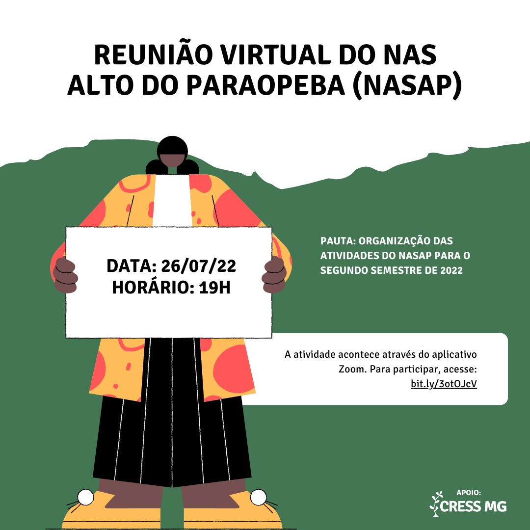 Nesta terça-feira, dia 26 de julho, às 19h, tem reunião virtual do NAS Alto do Paraopeba.
