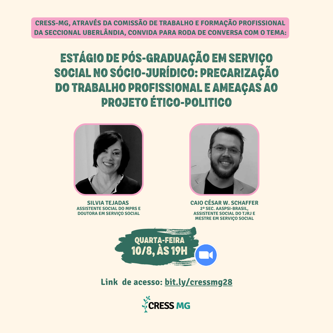 Sempre trazendo temas que estão em alta na categoria, na quarta-feira que vem, 10/08, às 19h, o CRESS-MG promoverá, através da Comissão de Trabalho e Formação Profissional da Seccional de Uberlândia, uma conversa sobre “Estágio de pós-graduação em Serviço Social no Sócio-jurídico: precarização do trabalho profissional e ameaças ao projeto ético-politico”.