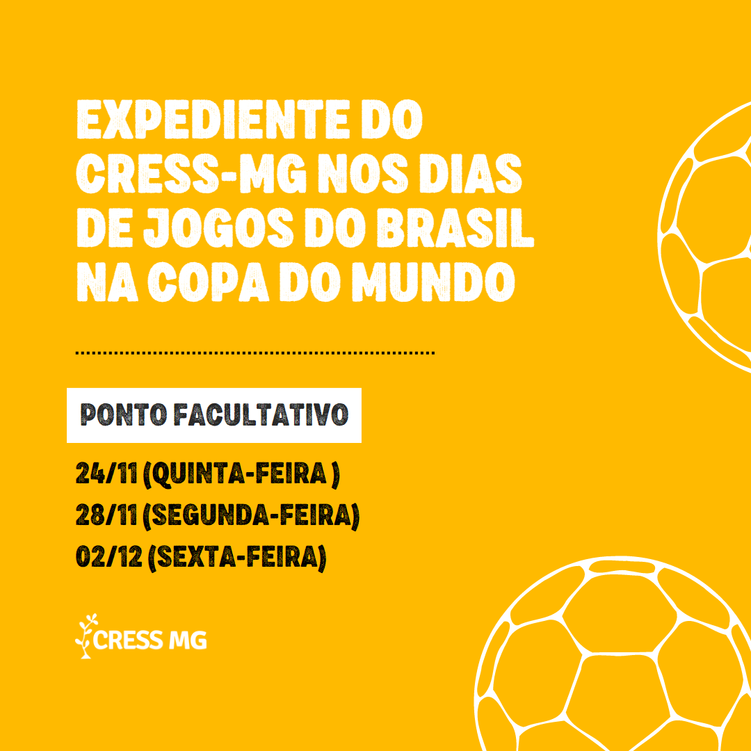 Fique atenta e atento: não haverá expediente no CRESS-MG (Sede e Seccionais) nas datas dos jogos da nossa seleção na primeira fase do mundial.