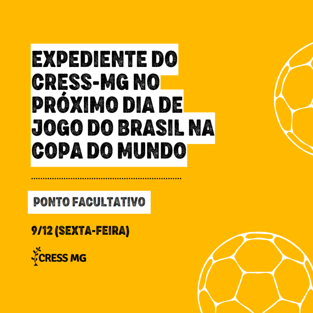 Nesta sexta-feira, dia 9/12, em virtude do jogo da Seleção Brasileira na Copa do Mundo, não haverá expediente na Sede do CRESS-MG, em Belo Horizonte, e nas Seccionais Juiz de Fora, Montes Claros e Uberlândia.