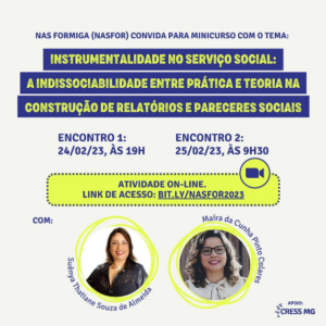 O Núcleo de Assistentes Sociais de Minas Gerais de Formiga (Nasfor) promove nos dias 24 e 25 de fevereiro, o minicurso sobre “Instrumentalidade no Serviço Social: o inseparável entre a prática e a teoria na construção de relatórios e opiniões sociais”.