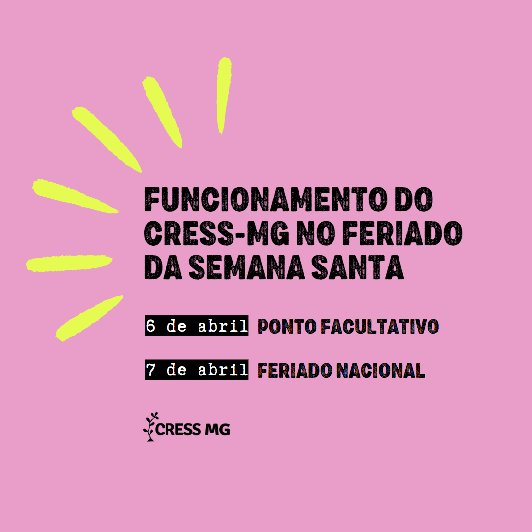 Em virtude do recesso e feriado nacional da Paixão de Cristo, o CRESS-MG não fará atendimento nos dias 06 e 07/04.