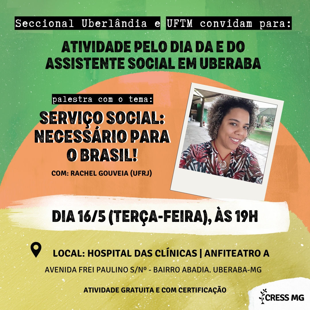 A Seccional Uberlândia do CRESS-MG e a Universidade Federal do Triângulo Mineiro (UFTM) convidam todas e todos para palestra com o tema “Serviço Social: necessário para o Brasil”, ministrada pela professora e doutora Rachel Gouveia, da Universidade Federal do Rio de Janeiro (UFRJ).