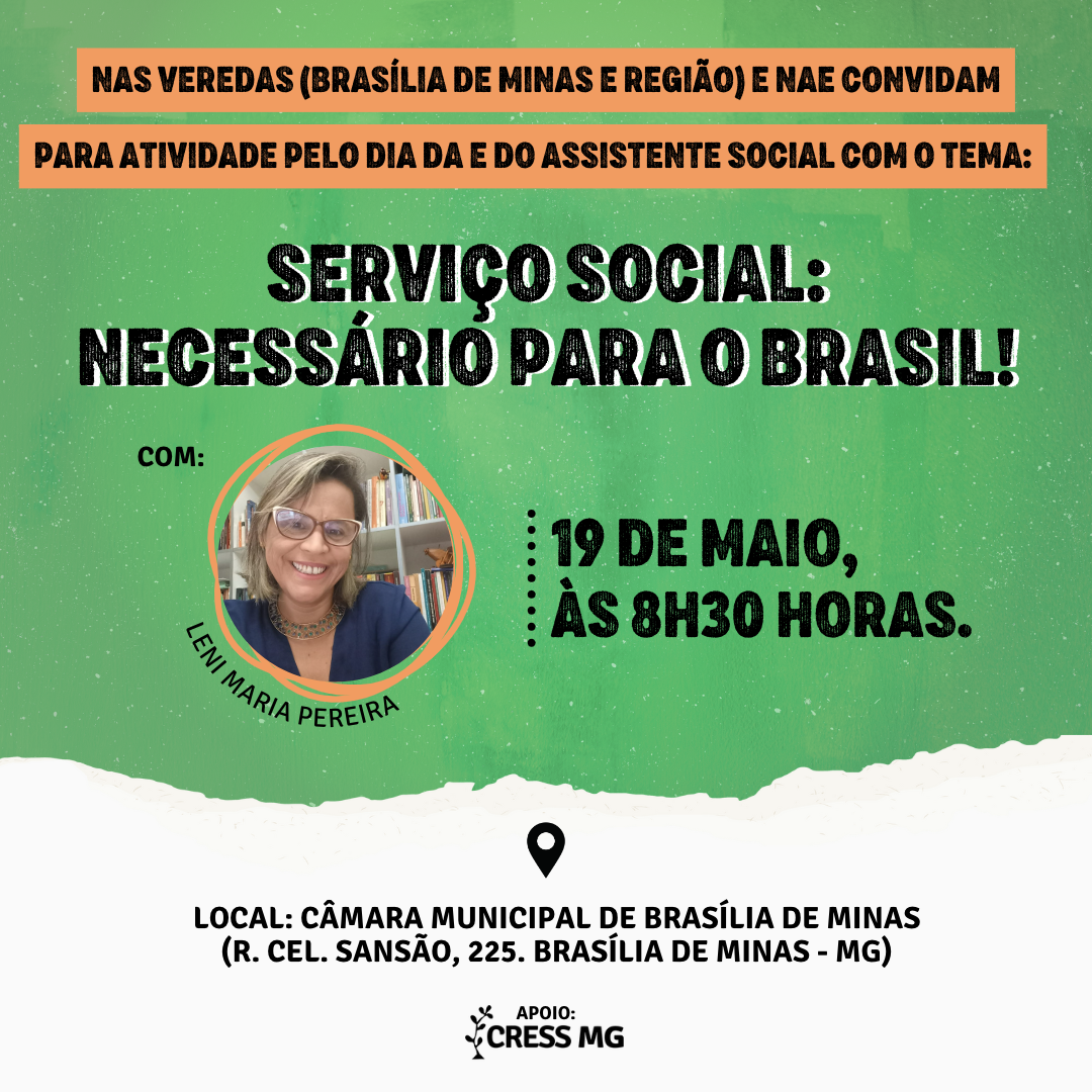 Estendendo a semana de comemoração pelo Dia da e do Assistente Social, o Núcleo de Apoio Educacional e NAS Veredas (Brasília de Minas e região) realizarão, no dia 19 de maio, às 8h30, a palestra “Serviço Social: necessário para o Brasil”.