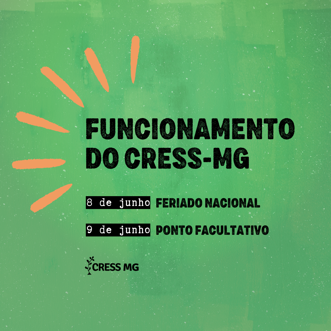Em virtude do feriado nacional de Corpus Christi e recesso, o CRESS-MG não fará atendimentos nos dias 8 e 9/06/23.