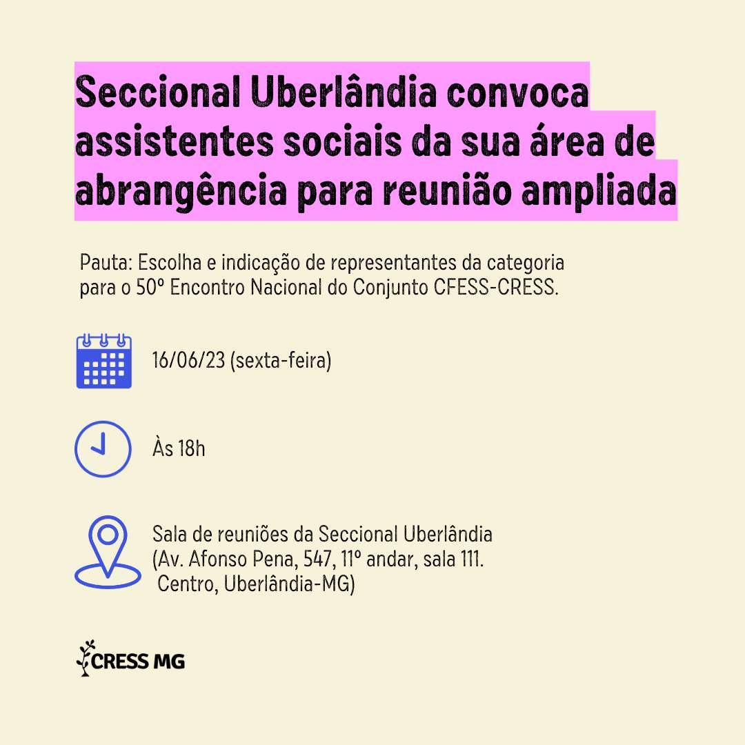 A Seccional Uberlândia do CRESS-MG convoca as e os assistentes sociais da sua área de abrangência para reunião ampliada.