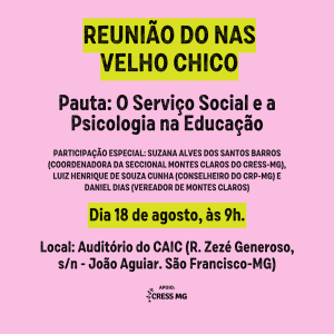 O Núcleo de Assistentes Sociais (NAS) Velho Chico se reúne mensalmente e, desta vez, o encontro será aberto às colegas psicólogas e psicólogos. Além disso, teremos pessoas convidadas a trazer elementos para pensarmos em estratégias para inserção dessas categorias na área.