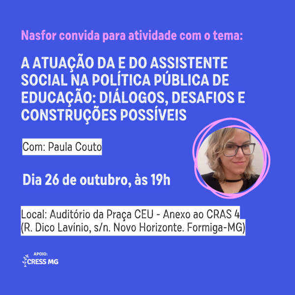 É de Formiga e região? Então fica a dica: fim do mês tem evento presencial em Formiga, para debater um tema super em alta na profissão, “Atuação de assistentes sociais na política de Educação”.