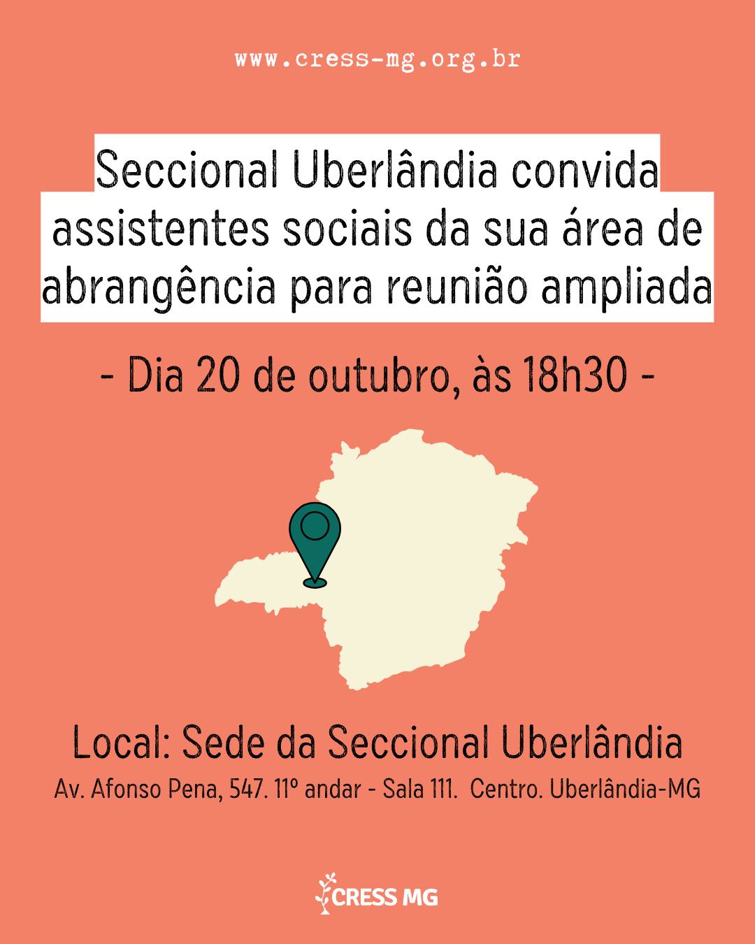 Seccional Uberlândia do CRESS-MG convida as e os assistentes sociais da sua área de abrangência para reunião ampliada.