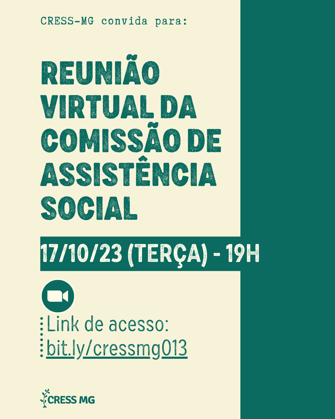 A próxima reunião on-line da Comissão de Assistência Social do CRESS-MG é na terça-feira que vem, dia 17/10/23, às 19h.
