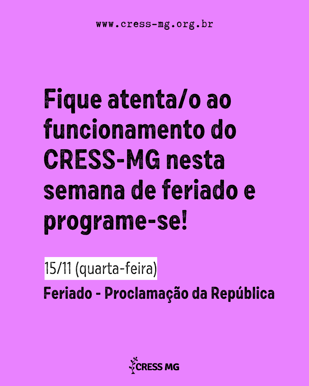 Programe-se! Quarta-feira (15/11) é feriado e o CRESS-MG não fará atendimento