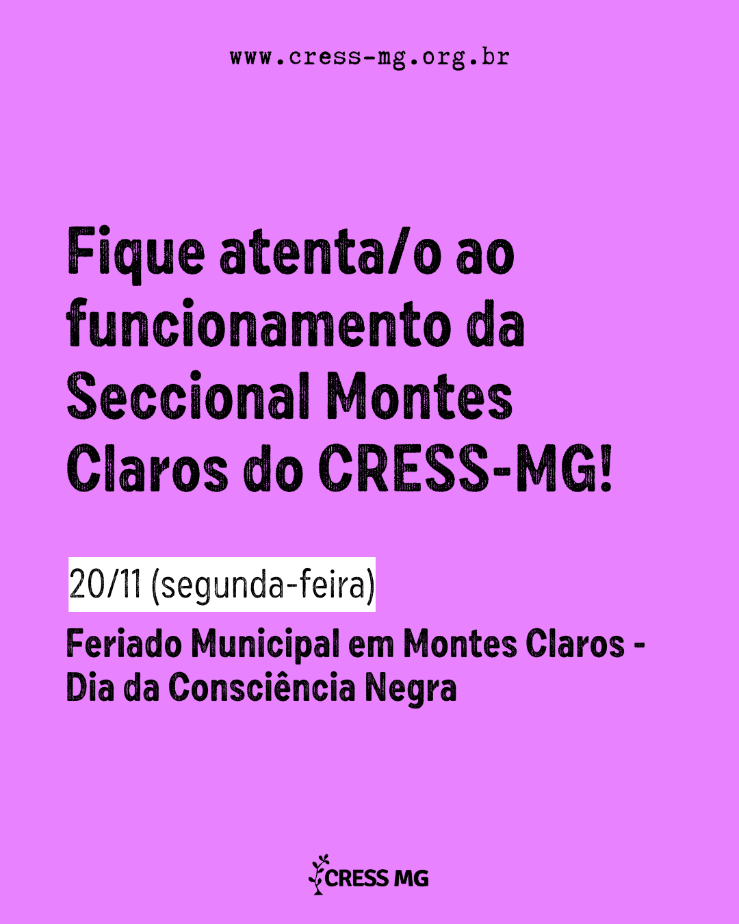 A Seccional Montes Claros do CRESS-MG não fará atendimento na próxima segunda-feira, dia 20 de novembro, em virtude do Dia da Consciência Negra, feriado municipal na cidade.