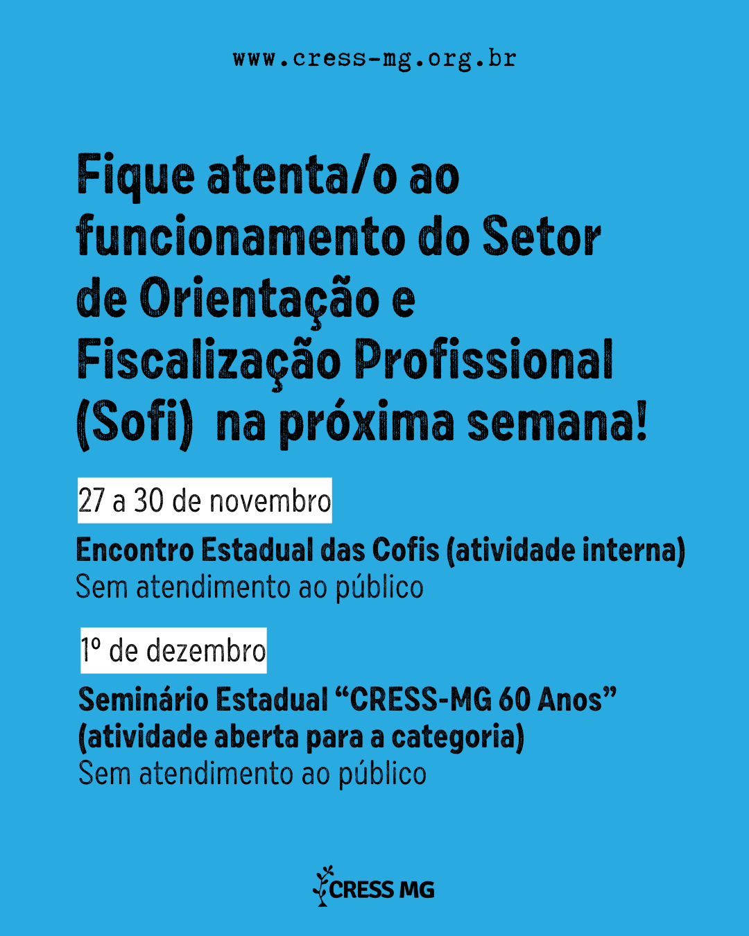 Na semana que vem acontecem atividades importantes aqui no CRESS-MG, como o Encontro Estadual das Cofis e o Seminário Estadual pelos nossos 60 anos.