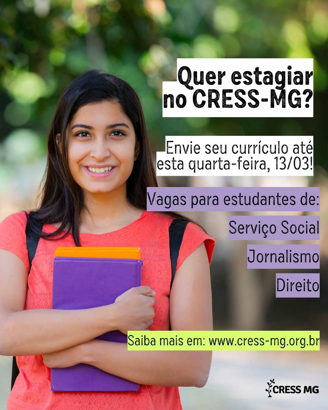 O CRESS-MG está com vagas abertas para estágio nas áreas de Direito, Jornalismo e Serviço Social. Para se candidatar, a ou o estudante devem enviar currículo para o e-mail [email protected] até esta quarta-feira, 13/03.