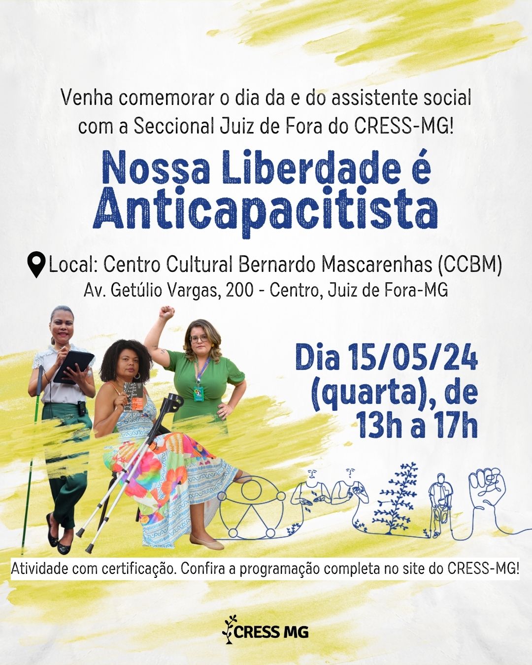 A Seccional Juiz de Fora promove na próxima quarta-feira, 15 de maio, um evento presencial pelo Dia da e do Assistente Social. O tema proposto pelo CFESS-CRESS a ser abordado em todo o país é a “Luta anticapacitista” por acessibilidade e visibilidade às pautas de pessoas com deficiência (PcDs).