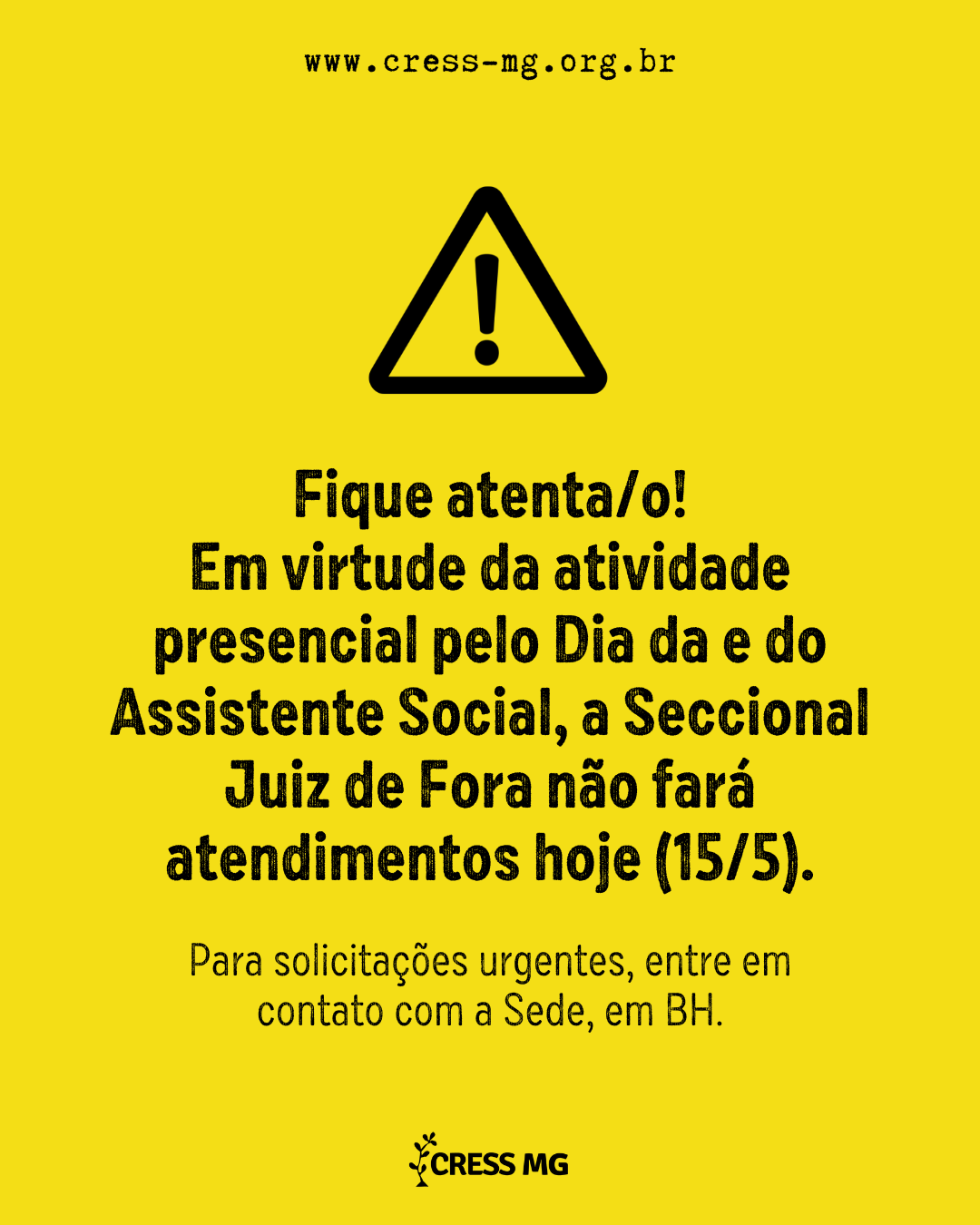 Em virtude da realização da atividade pelo Dia da e do Assistente Social, a Seccional Juiz de Fora do CRSES-MG não fará atendimentos hoje (15/5).