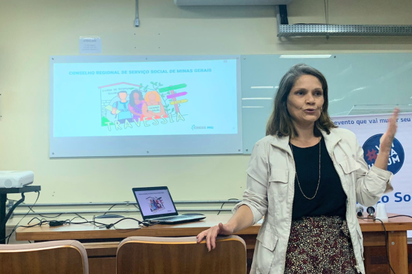 A atividade foi conduzida pela agente fiscal do CRESS-MG, Flávia Canesqui, que destacou a importância de preparar as futuras e futuros profissionais para os desafios do exercício profissional e a relevância da atuação do Conselho na defesa dos direitos e na regulamentação da profissão.