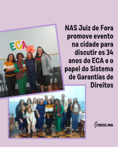 Aconteceu em Juiz de Fora, um evento em comemoração aos 34 anos da publicação do Estatuto da Criança e do Adolescente (ECA) – Lei nº 8.069, publicada em 13 de julho de 1990, destacando a importância do Sistema de Garantias de Direitos. A atividade ocorreu no dia 23 de julho, promovida pelo Núcleo de Assistentes Sociais local, o NAS JF.