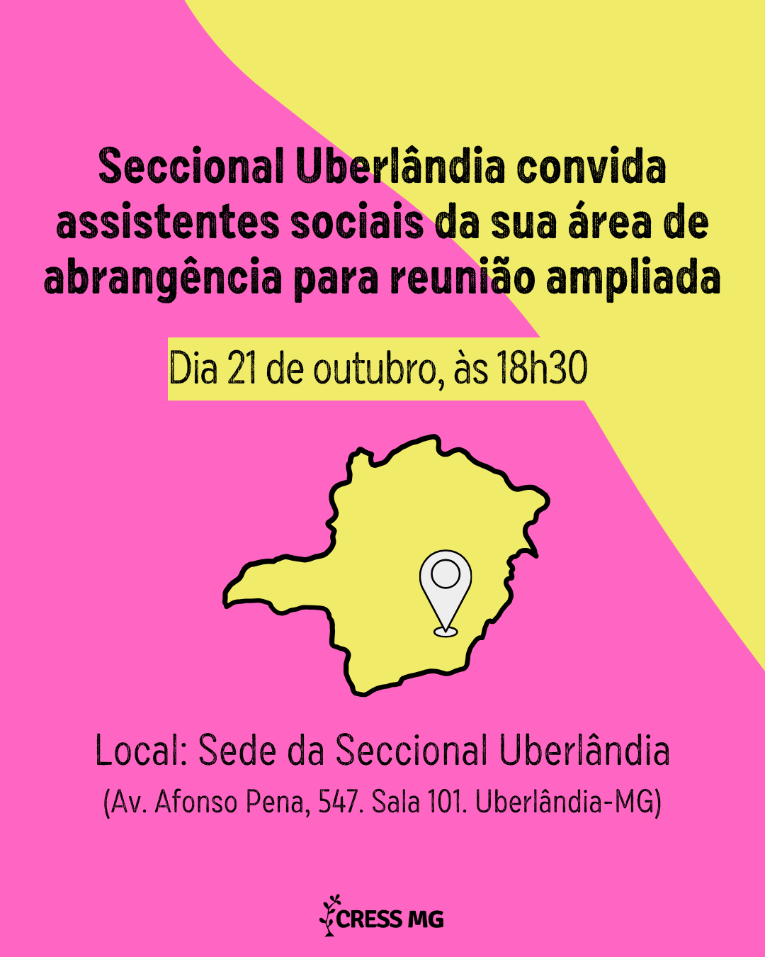 A Seccional Uberlândia do CRESS-MG convida as e os assistentes sociais da sua área de abrangência para reunião ampliada.