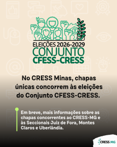 Em nosso estado, as eleições serão disputadas por chapas únicas, tanto do CRESS, como das Seccionais de Juiz de Fora, de Montes Claros e de Uberlândia. Em breve, a categoria conhecerá as propostas de gestão de cada uma delas.